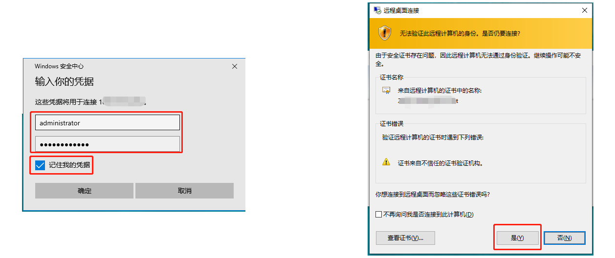 - 如果是首次连接,系统可能会显示证书警告,点击"是"继续连接